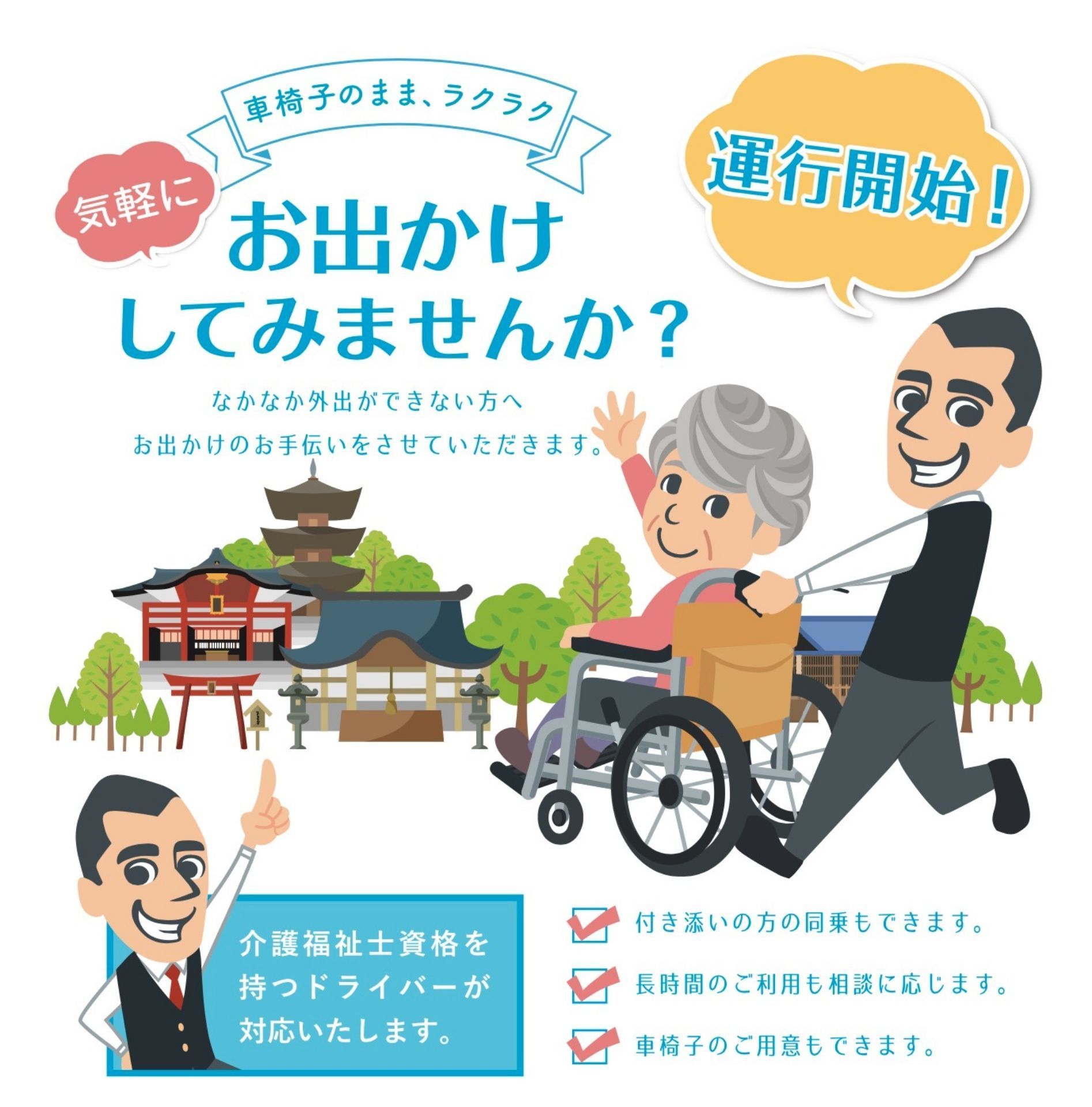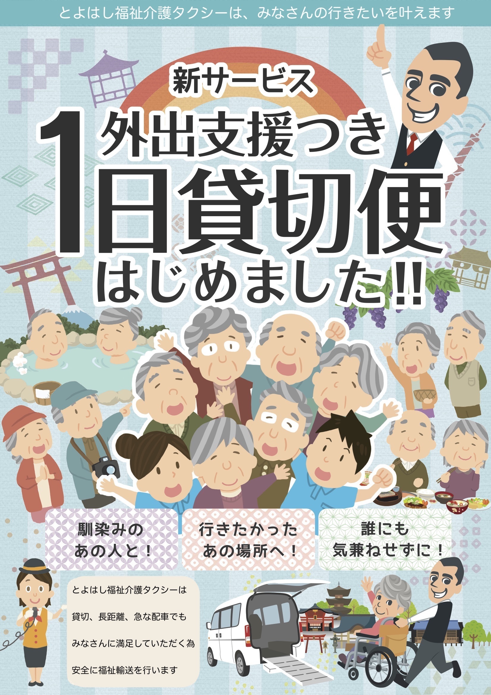 誰にも気兼ねせずに、行きたいと思っていた「お寺」「神社」「お墓参り」「ショッピング」「観光地」などドコへでも、仲の良い仲間たちと、一緒に行きたいあの人と、かわいい孫と、恩返しがしたいお世話になった方と、思い切ってお出かけしてみませんか?