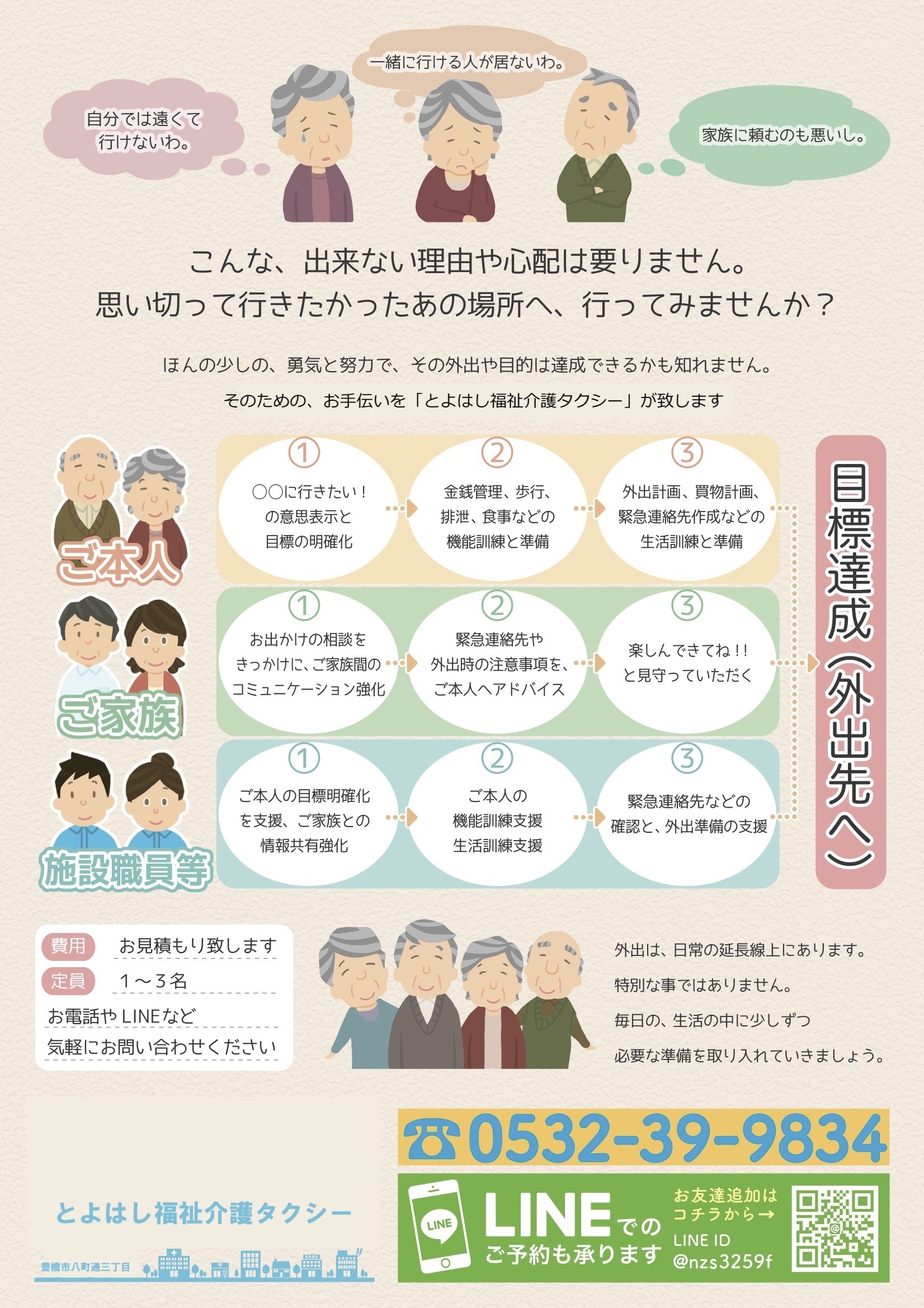 外出の支援をするだけではありません。ご本人様、ご家族様、施設職員さんの事まで考えています。ここまでやるのは地元密着型の「ちゃんタク」だけ!